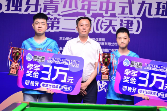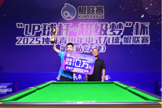 随后进入颁奖环节。黎骏熙和夏李奥获季军,恒轩(天津)体育发展有限公司总经理李志远为他们颁发 3 万元奖金及荣誉奖杯;季圣杰获亚军,天津市武清区城关镇副镇长常威为其颁发 5 万元奖金及荣誉奖杯,陈成汉在740 名鲲少年中脱颖而出,成功问鼎本鲲联赛事冠军。天津市武清区体育局副局长李春新为其颁发了 10 万元奖金及冠军奖杯。在《骄傲的少年》激昂的音乐声中,高高举起冠军奖杯,礼花绽放,现场气氛达到高潮。这一刻,不仅是陈成汉个人的荣耀,更是青少年台球力量的展现。