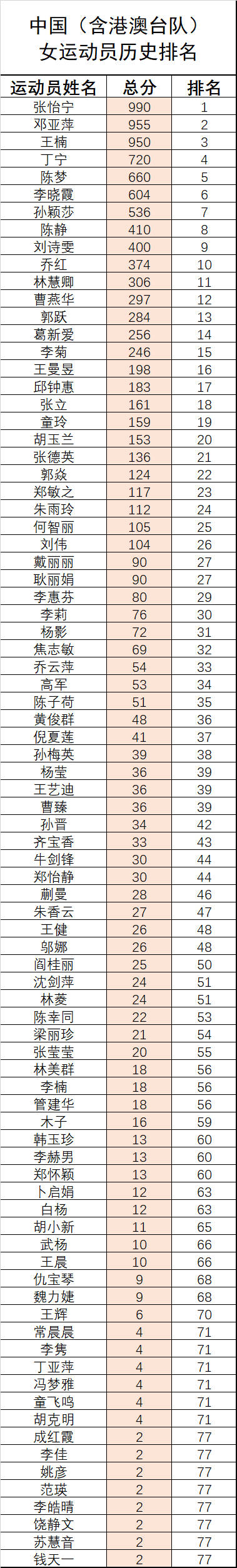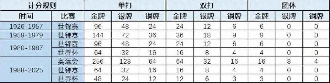 2. 因乒乓球于1988年才被纳入奥运会项目,1980年才首次举行乒乓球世界杯,因此我们将排名过程分为几个阶段,以便合理调配分数,提升早期世锦赛的得分,从而使不同时代顶尖运动员的“年均可得分”基本相当。