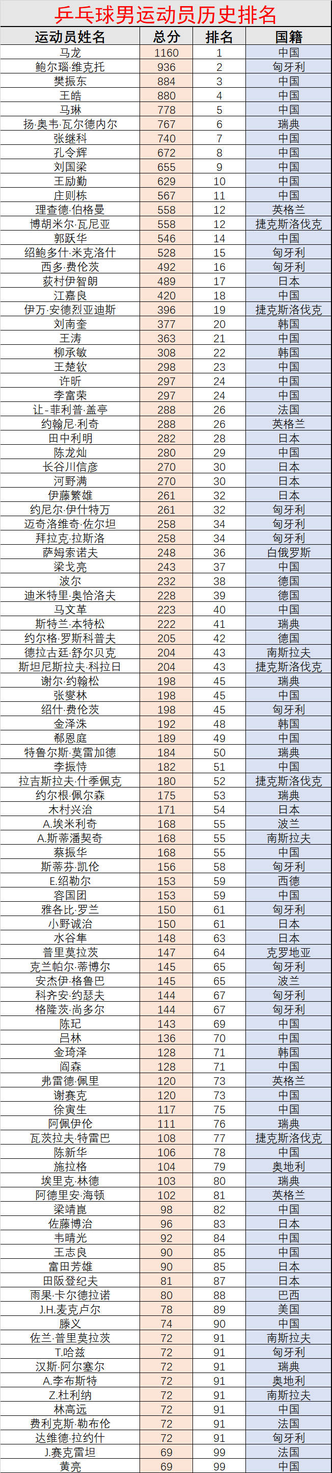 乒乓球百年历史男女运动员排名经典回顾与解析