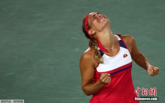 当地时间8月13日,2016里约奥运会网球女子单打决赛,波多黎各选手普伊格2-1战胜2号种子今年澳网冠军、德国选手科贝尔,夺得冠军。这也是波多黎各史上首枚奥运金牌。图为普伊格庆祝胜利。