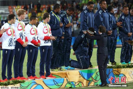 当地时间8月11日,里约奥运会男子7人制橄榄球决赛中,赛前夺冠热门斐济队以43:7的比分“吊打”英国,赢得了斐济代表团历史上的首枚奥运金牌。此前斐济选手在奥运会上从未获得过任何奖牌。颁奖仪式上,由英国安妮公主颁发奖牌,一名斐济选手跪下领奖。